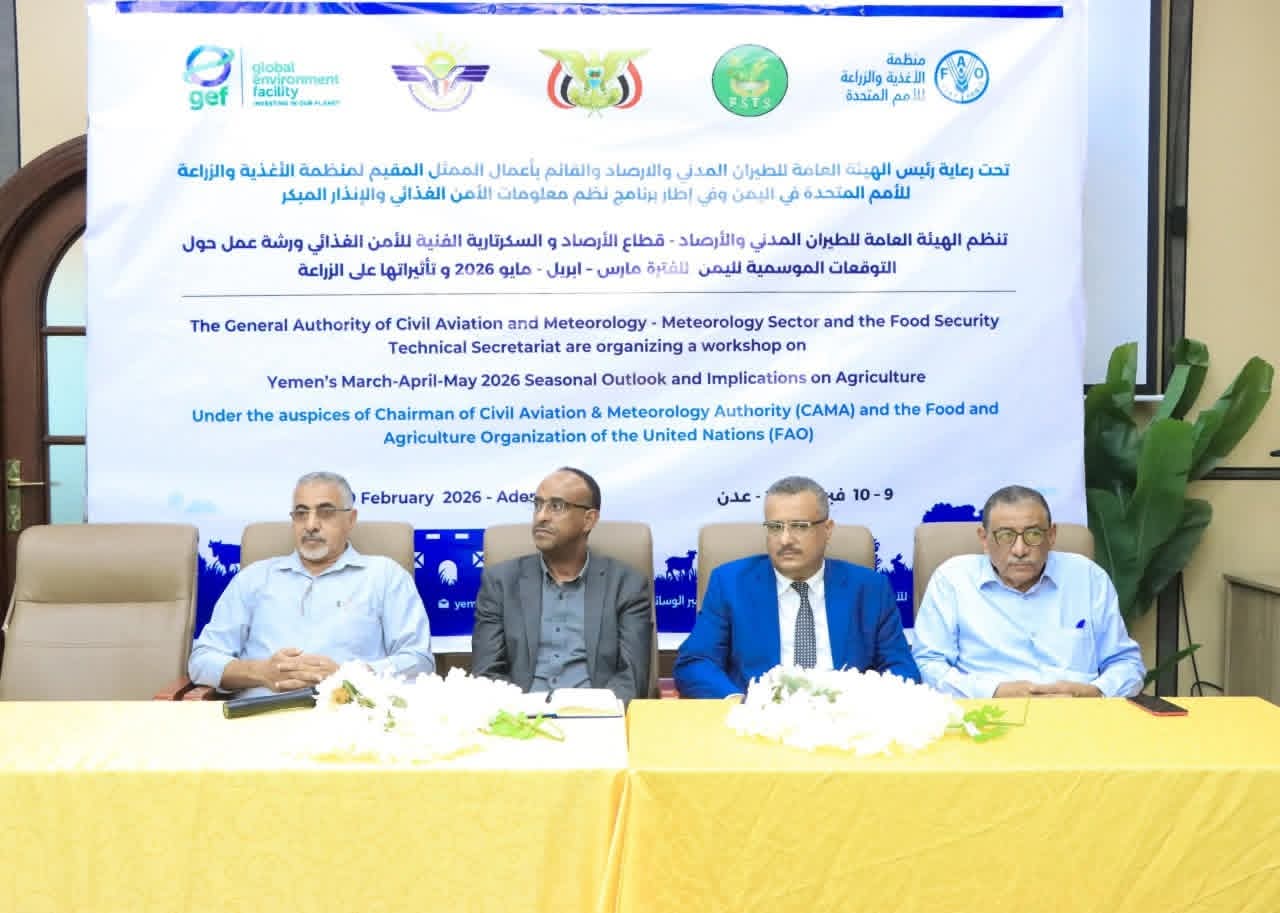 عدن / إعلام الوزارة بمشاركة وزارة الزراعة والري والثروة السمكية وبرعاية الهيئة العامة للطيران المدني والارصاد ومنظمة الأغذية والزراعة للأمم المتحدة في اليمن وفي إطار برنامج نظم معلومات الأمن الغذائي والإنذار المبكر عُقدت ورشة عمل حول التوقعات الموسمية لليمن للفترة مارس – أبريل – مايو 2026 وتأثيراتها على الأمن الغذائي…