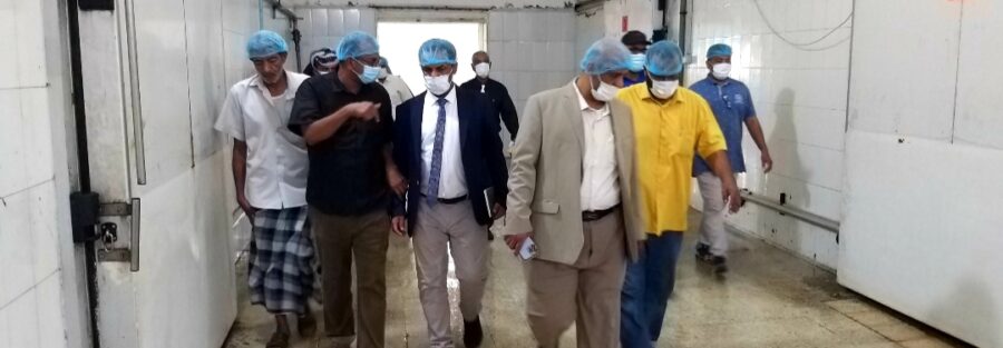 قامت لجنة وزارة الزراعة والري والثروة السمكية، الخاصة بمعاينة وتقييم المنشأت السمكية في محافظتي حضرموت والمهرة، المشكلة من قبل، وزير الزراعة والري والثروة السمكية، اللواء/ سالم عبداللة السقطري، على ضوء مخرجات، مجلس الوزراء، برئاسة وكيل الوزارة لقطاع الخدمات والأنتاج والتسويق السمكي، غازي لحمر، أليوم، بزيارة تفقدية الى مصنع المكلا لتعليب الأسماك- الغويزي، بمحافطة حضرموت، في أطار برنامج نزولاتها الميدانية، للأطلاع على مدى جاهزية المنشآت السمكية الحكومية والخاصة، وتفقد معامل التحضير ومصانع أنتاج تعليب الأسماك، ومتابعة الجوانب التطويرية لعمليات التصنيع والتسويق، بهدف الحفاظ على مكانة المنتجات المحلية السمكية.
