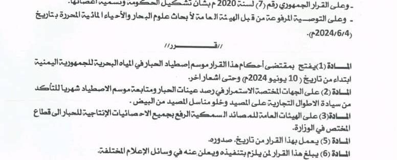 1- يفتح بمقتضى أحكام هذا القرار موسم إصطياد الحبار في المياه البحرية للجمهورية اليمنية ابتداء من تاريخ (10 يونيو2024) حتى إشعار آخر.