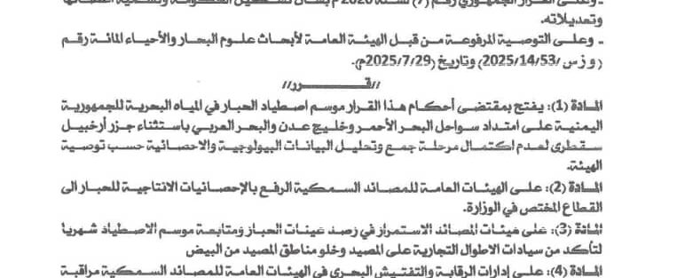 وألزم القرار الجهات المختصة في المصائد السمكية برفع الإحصائيات الإنتاجية للموسم إلى القطاع المختص بالوزارة، إلى جانب تكثيف جهود الرقابة لضبط عمليات الصيد وضمان الالتزام باللوائح المنظمة للموسم.