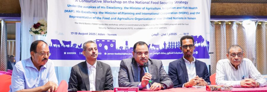 دشن معالي وزير الزراعة والري والثروة السمكية، اللواء سالم عبد الله السقطري اليوم، بالعاصمة عدن، ورشة العمل التشاورية الخاصة بمناقشة مسودة الاستراتيجية الوطنية للأمن الغذائي، والتي يتم إعدادها بدعم فني من منظمة الأغذية والزراعة للأمم المتحدة (الفاو)، وبمشاركة وزارة التخطيط والتعاون الدولي وعدد من الخبراء والجهات المعنية.