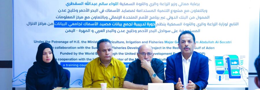 برعاية معالي وزير الزراعة والري والثروة السمكية اللواء سالم عبد الله السقطري، وفي إطار الجهود الرامية إلى تعزيز التنمية المستدامة لمصائد الأسماك في البحر الأحمر وخليج عدن، انطلقت دورة تدريبية خاصة بجمع بيانات مصيد الأسماك لجامعي البيانات، وذلك بالتعاون مع مشروع تنمية مستدامة لمصائد الأسماك الممول من البنك الدولي عبر برنامج الأمم المتحدة الإنمائي، وبالشراكة مع مركز المعلومات التابع للوزارة، مستهدفة عدداً من مراكز الإنزال السمكي على سواحل البحر الأحمر وخليج عدن والبحر العربي في محافظتي عدن والمهرة