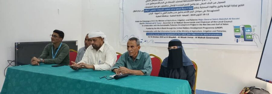 وأُقيمت الدورة برعاية معالي وزير الزراعة والري والثروة السمكية اللواء سالم عبدالله السقطري، ومحافظ محافظة المهرة الأستاذ محمد علي ياسر، وبتمويل من البنك الدولي عبر برنامج الأمم المتحدة الإنمائي (UNDP)، وبالتعاون مع مركز المعلومات التابع لوزارة الزراعة والري والثروة السمكية، بهدف رفع قدرات المتدربين في جمع وتحليل بيانات مصيد الأسماك من مراكز الإنزال السمكي.