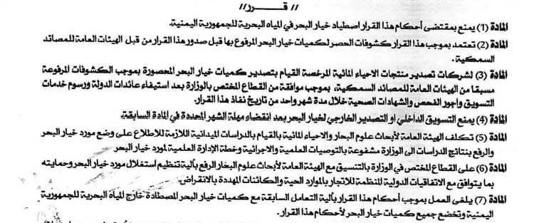 ونص القرار في مادته الأولى على منع اصطياد خيار البحر بشكل كامل داخل المياه البحرية اليمنية، فيما أقرّت المادة الثانية اعتماد كشوفات الحصر للكميات التي جرى اصطيادها قبل صدور القرار من قبل الهيئات العامة للمصائد السمكية.