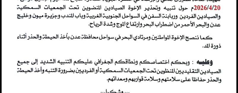 حذّرت الادارة العامة للرقابة والتفتيش البحري بوزارة الزراعة والري والثروة السمكية الصيادين ومرتادي البحر من دخول المياه الإقليمية للجمهورية اليمنية بسبب اضطراب البحر وارتفاع الموج والرياح الشديدة التي ستضرب
