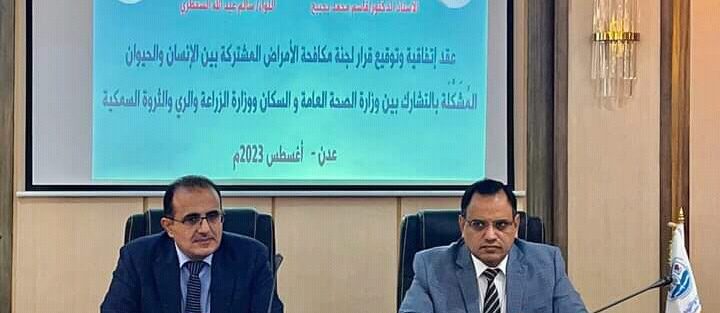 وقع معالي وزير الزراعة والري والثروة السمكية اللواء/ سالم عبدالله السقطري ومعالي وزير الصحة العامة والسكان أ.د/قاسم بحيبح صباح اليوم بديوان عام وزارة الزراعة والري والثروة السمكية بالعاصمة عدن على إتفاقية وقرار لجنة مكافحة الأمراض المشتركة بين الإنسان والحيوان ،والمشّكلة بالتشارك بين وزارتي الصحة العامة والسكان ووزارة الزراعة والري والثروة السمكية .