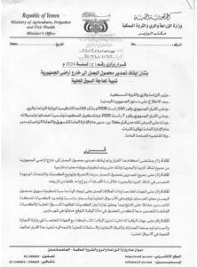 ونص القرار بعد الديباجة والخلفيات القانونية التي استند عليها، على ان يتم إيقاف تصدير محصول البصل إلى خارج أراضي الجمهورية اليمنية من جميع المنافذ البرية والبحرية، حتى يتم تنظيم تسويقه محلياً وخارجياً، حثآ جميع المصدرين لمحصول البصل، سرعة التصرف، وتوزيع الكميات والشحنات الموجودة للتصدير في المنافذ البرية والبحرية خلال مدة أقصاها أسبوع واحد فقط من تاريخه.