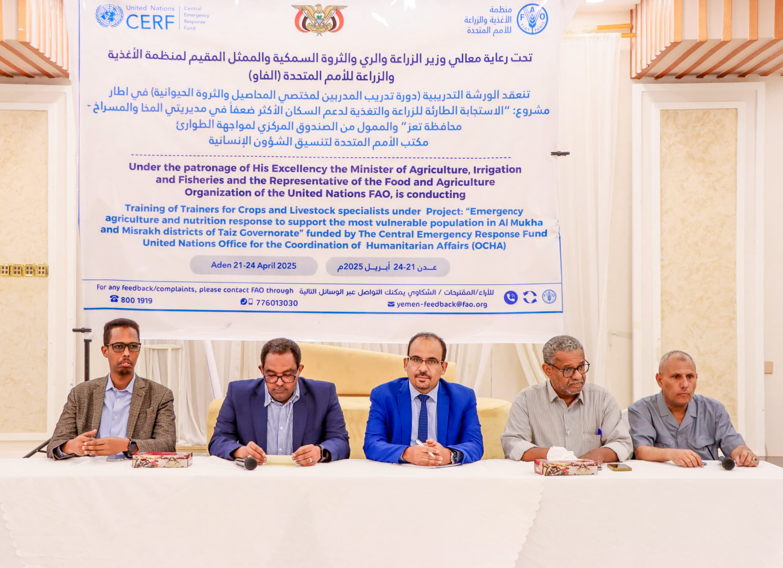 عدن–إعلام الوزارة تحت رعاية معالي وزير الزراعة والري والثروة السمكية، اللواء سالم عبدالله السقطري، والممثل المقيم لمنظمة الأغذية والزراعة للأمم المتحدة (الفاو) في اليمن، الدكتور حسين جادين، انطلقت في العاصمة عدن، اليوم، ورشة تدريب كبار المدربين لمختصي المحاصيل والثروة الحيوانية في مديريتي المخا والمسراخ بمحافظة تعز. وتأتي هذه الورشة ضمن…