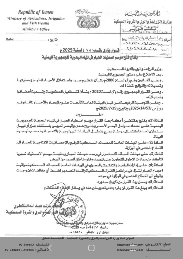 الأثنين – 18 أغسطس 2025 1:00 م بتوقيت عدن عدن| إعلام الوزارة استقبل معالي وزير الزراعة والري والثروة السمكية، اللواء سالم السقطري، وفداً من البنك الدولي برئاسة السيد مانيفانان باثي، أخصائي أول في قطاع الزراعة، لمناقشة تدخلات المشاريع الجديدة التي يعتزم البنك الدولي تنفيدها في بلادنا في مجال الزراعة. واستمع…